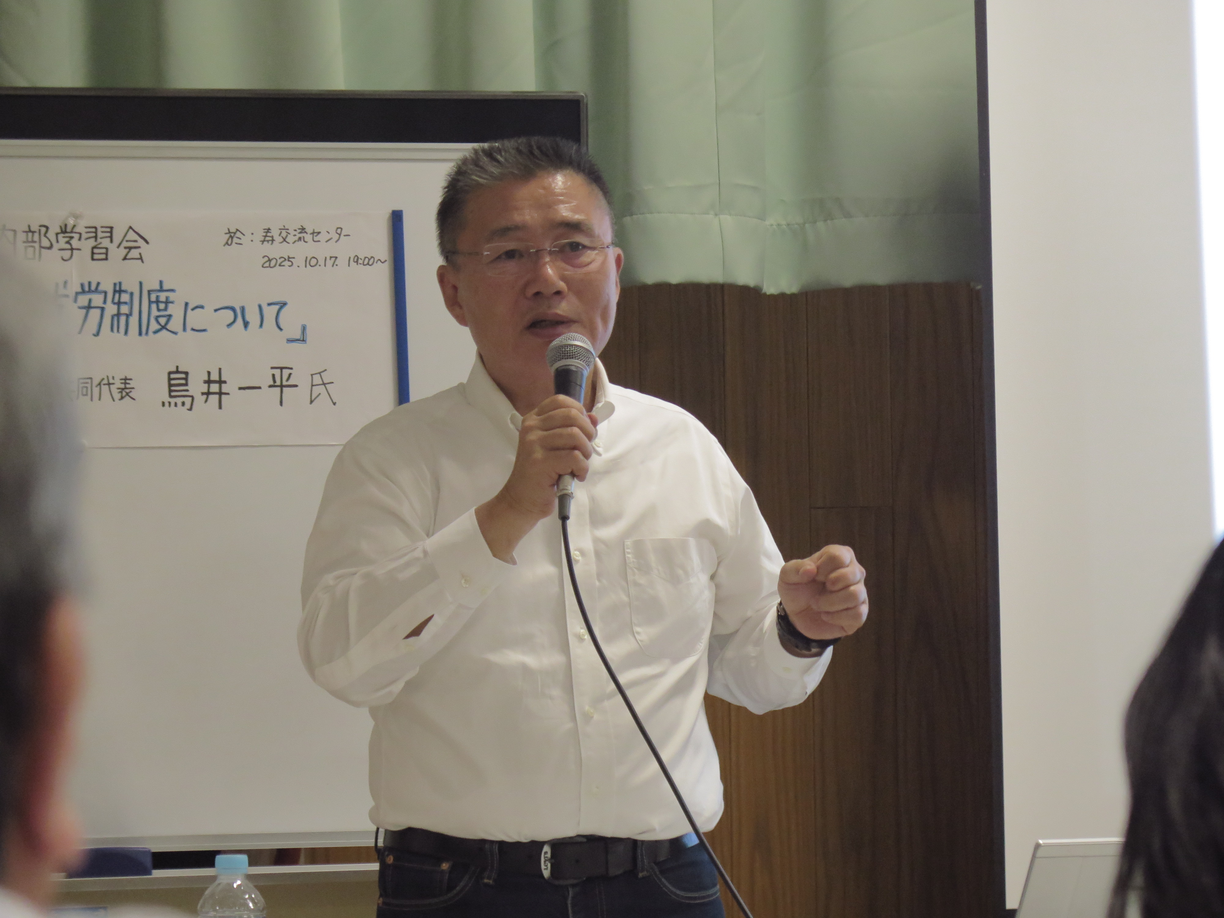 移住連(移住者と連帯する全国ネットワーク)の代表鳥井一平氏をお招きしてのカラバオの会内部学習会が、横浜市寿町健康福祉交流センターで開かれました。カラバオの会関係者や協働スペーススタッフなど15名ほどが参加し、育成就労をはじめとする外国人労働者受け入れ制度の問題点や現状を学びました。